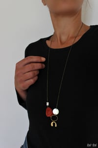 Sautoir confectionné à partir d'une pièce de bambou de mer, de pierres de howlite et de pièces de laiton.
